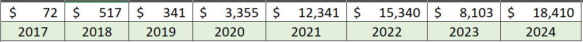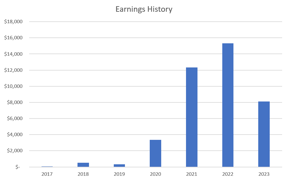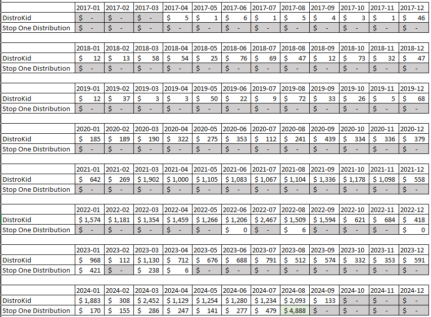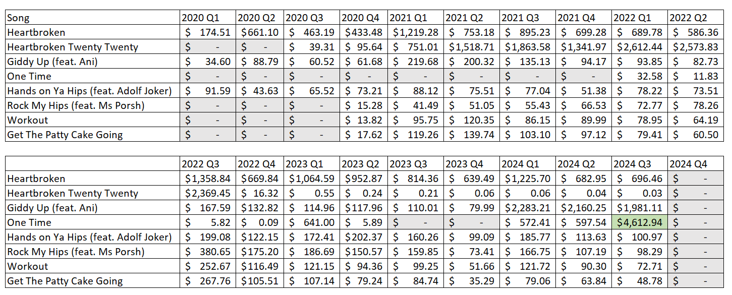 DistroKid contains 101 titles, featuring many of the top earners with an increase in 2024 largely driven by the song, “Giddy Up (feat. Ani),” from YouTube and Apple Music despite the song being released in 2019. Peak royalties in 2022 and 2023 follow the natural consumption and delay curve for the top two songs, “Heartbroken,” and “Heartbroken Twenty Twenty.”
