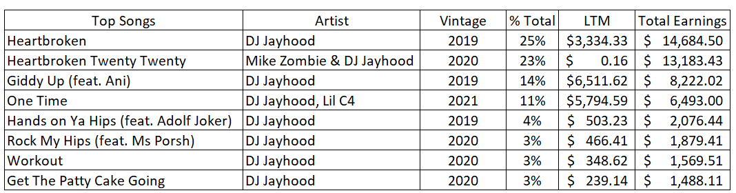 Overall, we can expect this catalog to continue earning in the range of approx. $12K – 15K annually due to its diversified set of top earners (top 85% is amongst 8 key titles) across streaming platforms such as Spotify, YouTube, and Apple Music. Also, the various versions of the top song, “Heartbroken,” has proven its ability to be interpolated into different recordings by top artists, and might have a future opportunity for further sample licensing in the future.
