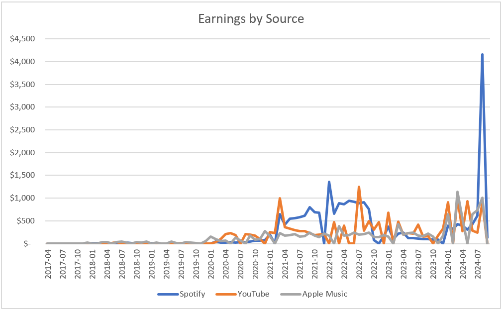 Spotify, YouTube, and Apple Music collectively made up over 90% of this catalog’s earnings. With the exception of the aforementioned increase from Spotify on the song, “One Time, average earnings on these sources are approx. $175 per month.