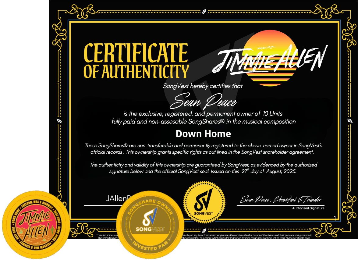 Ownership of a SongShare in “Down Home – Jimmie Allen” represents a security interest under a Royalty Share Agreement. This Agreement is between the seller of the song rights and SongVest.